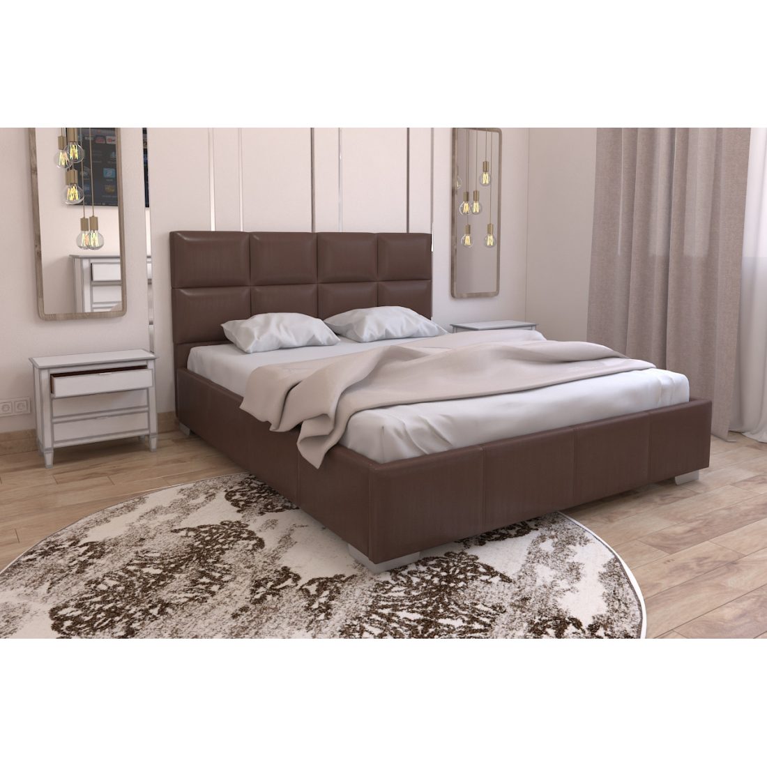 Боковини і узголів'я ліжка виконані з ДСП, наповнення ППУ і синтепон, які оббиваються шкірзамінником або тканиною, кріпляться до основи ліжка з металевого каркаса. Глибина ящика становить 20 см, складається з ламінованого HDF білого кольору і має 4 вентиляційні заглушки.